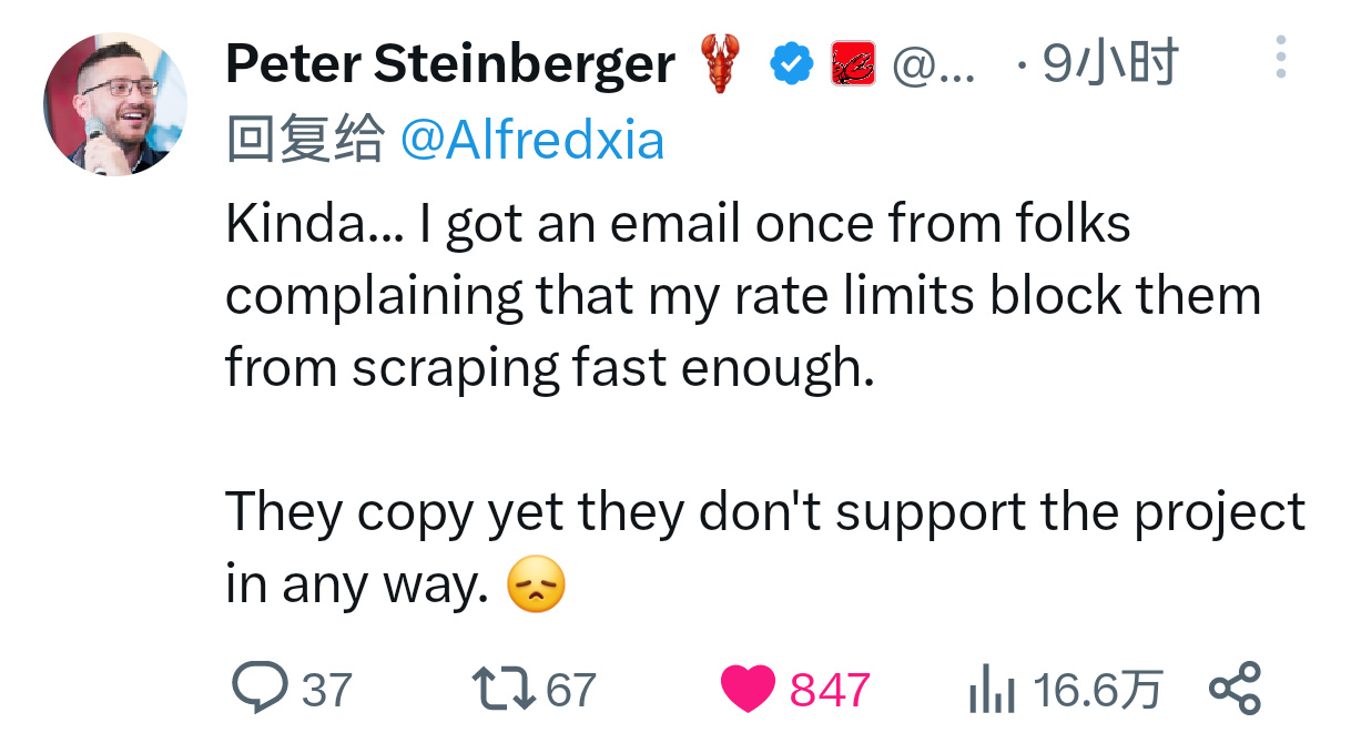 一位奥地利知名程序员、OpenClaw(🦞)创始人Peter Steinberger在推特回应