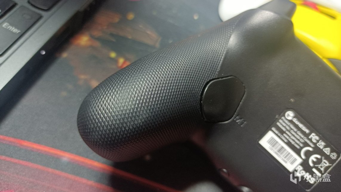 手柄背后的区别就有点大了。小鸡G7相比xbox x加入了两个背键,背键不大不小手感还可以。虽然没有其他国产手柄动辄四五个背键那么多,但是其实两个也完全够用。握持部分,xbox手柄采用了磨砂纹,小鸡G7则包裹上了一层橡胶,橡胶上布满了磨砂纹,增大了舒适度也一定程度上防滑。这种细致的磨砂纹虽然粘手,但是入泥,普通的清洁有点难清灰。
