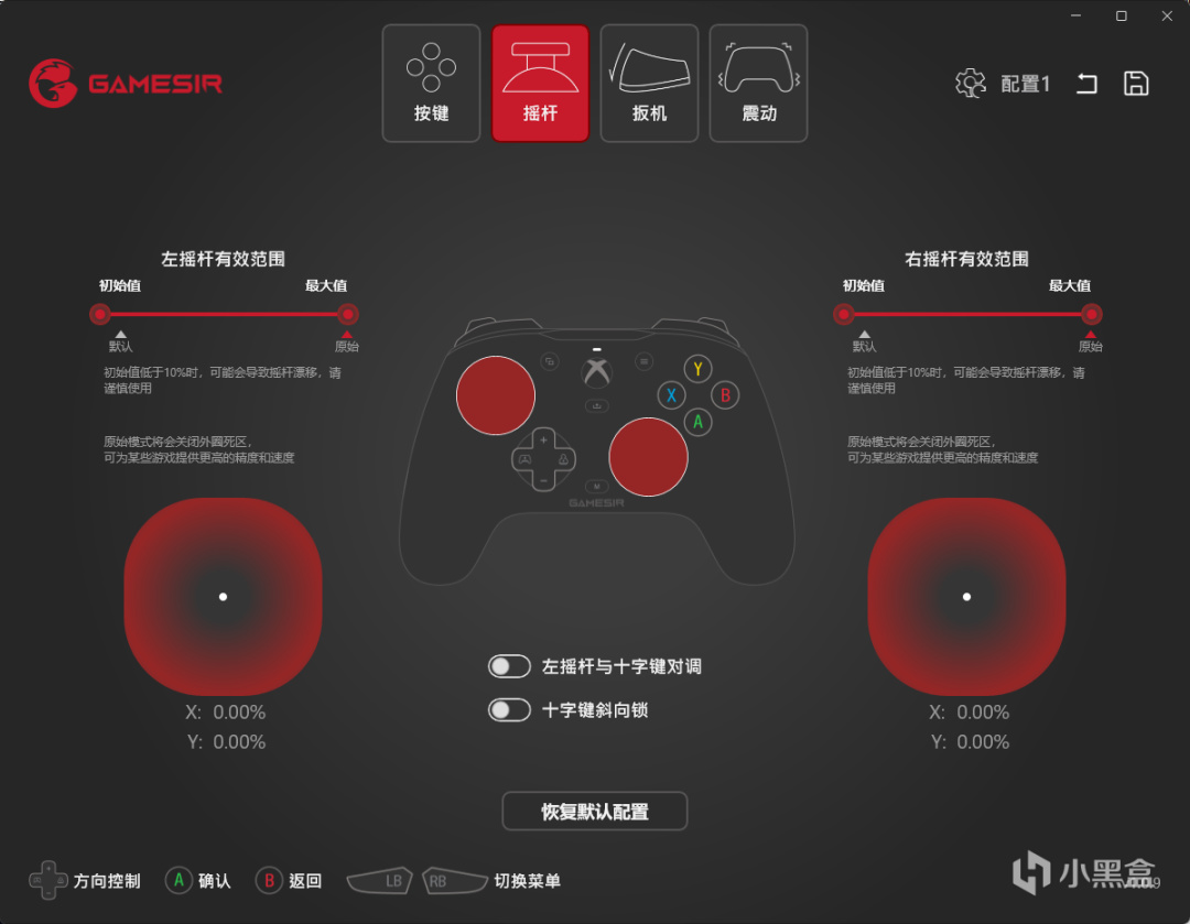 这款手柄摇杆的上手体验也非常不错,转动非常顺滑。虽然比不过一些国产精英说变,但在这个价位无论是中心杆,还是回正的力距都非常棒,都非常接近xbox手柄。遥杆使用Alps遥杆,玩家可以在驱动里根据自己的需求来调整摇杆的有效区域。摇杆出⼚有默认10%的中⼼死区,和外圈画原死区。喜欢拿手柄玩fps游戏的玩家,可以在App 中调整中心和外圈任意⼤⼩的死区。