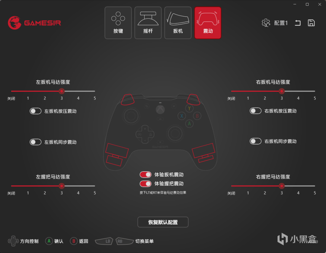 最后来关注一下震动方面的表现。这款手柄一共配备了四个震动马达,分别分布在双侧的握把和扳机处。震动感觉还算细腻,特别是用来打只狼的时候振刀的震动,配上叮叮的打铁声,十分过瘾。这4个震动马达也支持自定义调节,玩家可以根据自己的喜好调整每一个马达的震动幅度。可惜,我在玩fps游戏时手柄并没有支持体感,可能也是xbox授权的局限性吧。