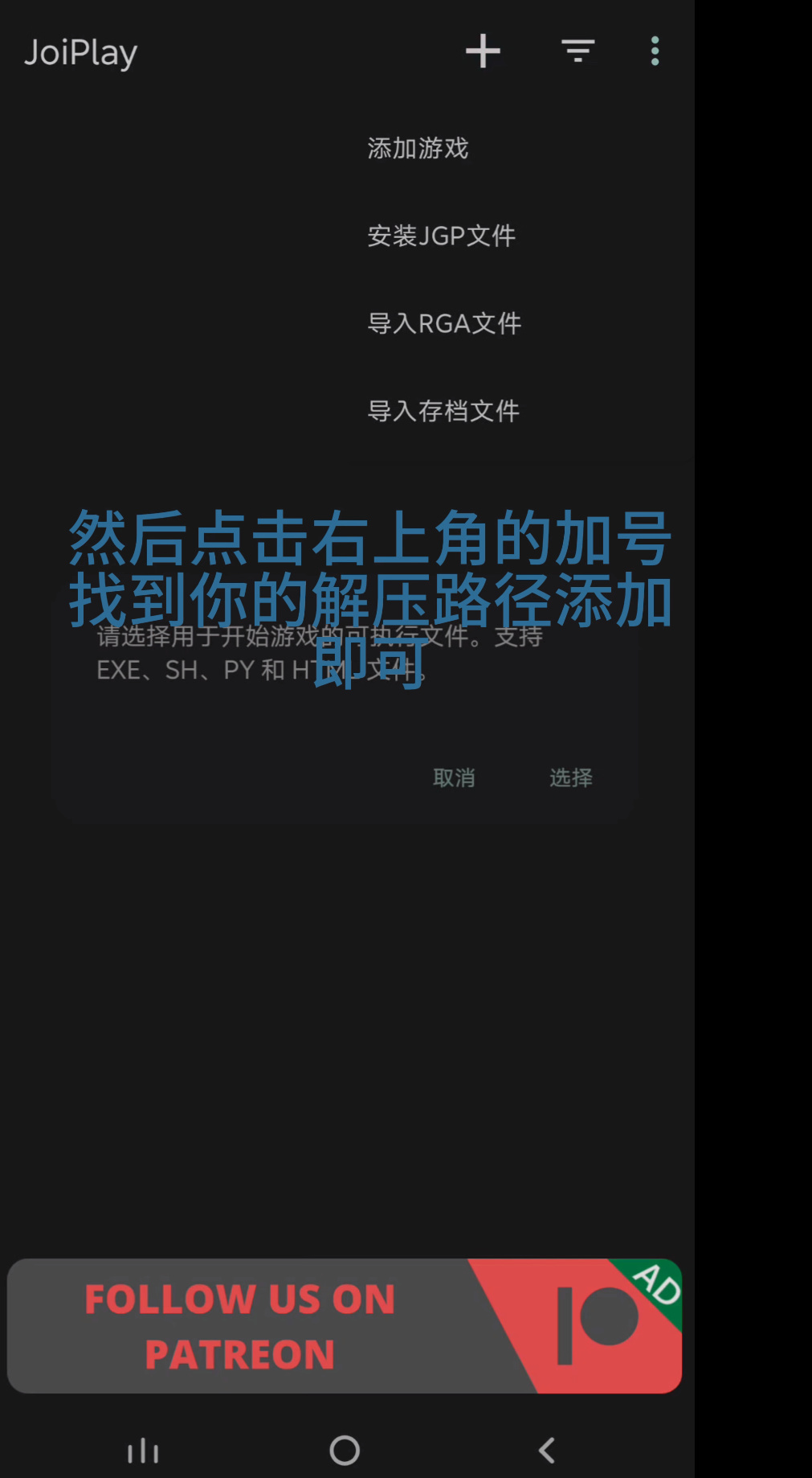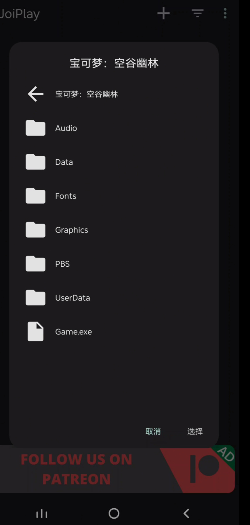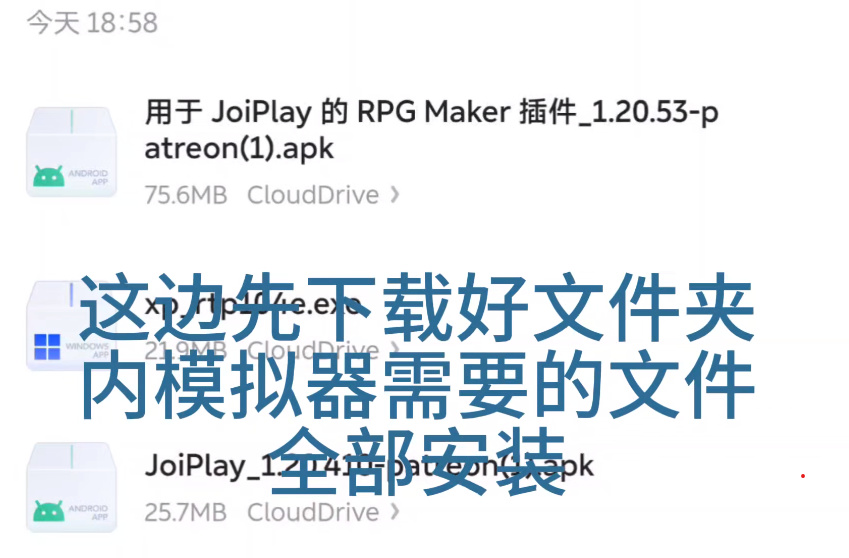 首先就是要先下载好里边的三个文件,分别是:用于 JoiPlay 的 RPG Maker 插件_1.20.53-patreon、JoiPlay_1.20.410-patreon、xp_rtp104e 用不同的版本号我不知道会不会出问题,反正我用的是这三个 ,关于xp_rtp104e好像有些小伙伴的手机可以不用安装直接使用,有些小伙伴会在打开时提示需要rtp运时包才能运行,选择这个即可。