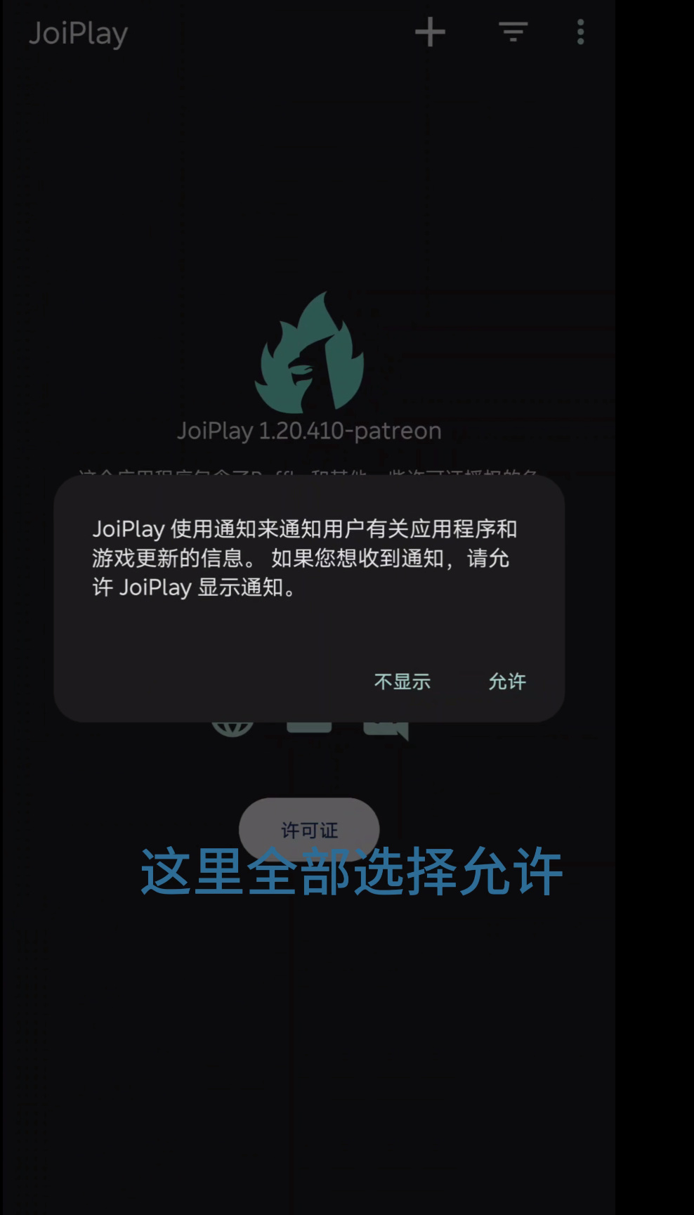解压完成之后我们就可以返回桌面打开我们的joiplay模拟器了。一般你上面两个都安装了的话会出现这两个图标,选择第一个打开。这边我们要全部选择允许!全部选择允许!全部选择允许!!!!重要的事情说三遍。