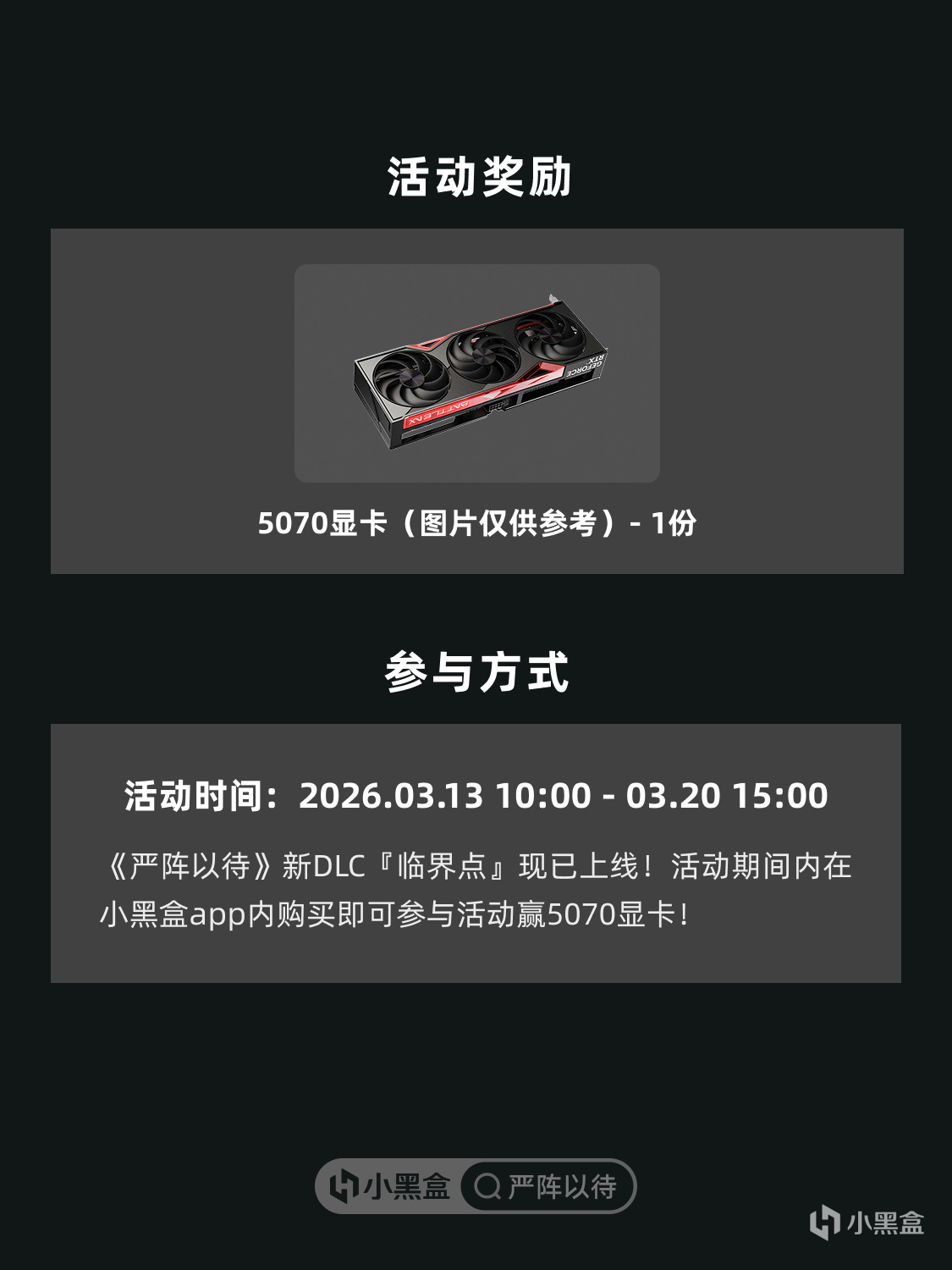 《嚴陣以待》「臨界點」已上線!活動期間在小黑盒購買『臨界點』,即可參與活動,贏取5070顯卡。https://api.xiaoheihe.cn/store/roll_room_v2?award_id=6516