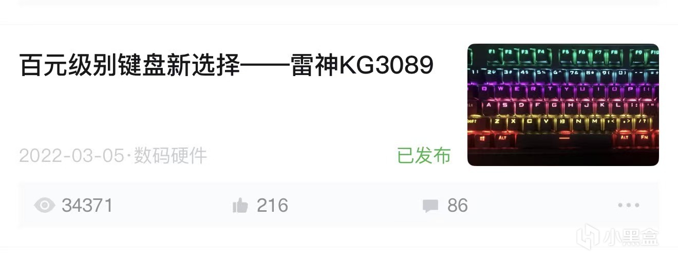 2022年3月5日,我收到了我人生中第一把媒体送测产品,是来自于小黑盒官方众测的雷神KG3089这款键盘,这是我非常高兴,开心的一天,真的,我当时真的好开心,我终于收到了不用自己买的产品。