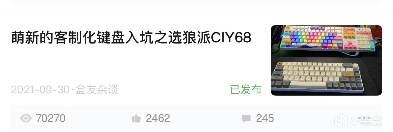 2021年9月30日,我在我的大学宿舍发布了我第一篇做博主的文章,这篇文章的数据非常好,这对我来说真的非常开心,这么多朋友都看我的文章,然后我就开始继续写,但是当时没粉丝量,没知名度,同样也没钱,样品需要自己买,品牌商是不会给我这个没有任何粉丝的博主送测的,所以我省吃俭用,我在满足我大学生活开销的同时,极大程度的节省开销,买轴,买套件,买键帽。做内容,小快乐从原来的11一盒下降到7块一盒,就是为了省下更多的钱来买这些产品。同时我也开始恶补外设相关知识,后面发布了一些其他的内容,数据也是十分不错的,这里要感谢各位盒友兄弟们。