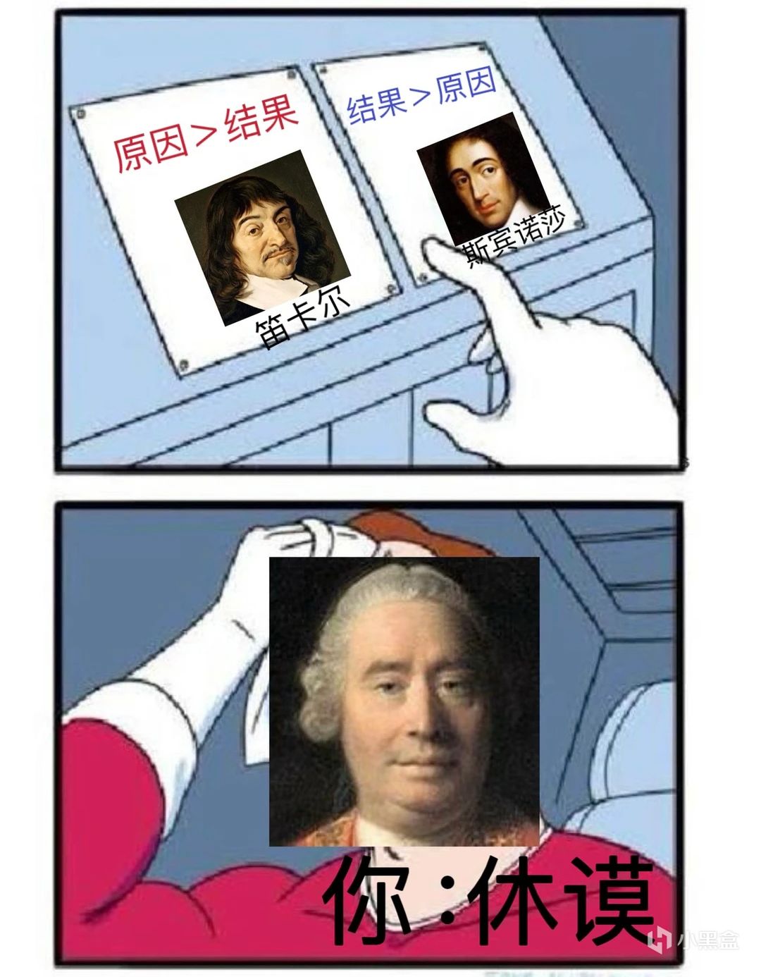 后来他又提出了心物二元论,把世界分成了 心灵 和 物质 两部分,虽然给后来的哲学家留下了身心关系这个难题,但也为现代哲学和科学提供了重要的思考框架。