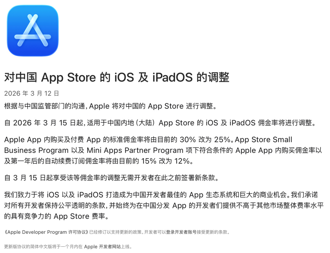 自2026年3月15日起,适用于中国内地App Store的iOS与iPadOS佣金率将正式下调:标准佣金率由30%降至25%;而适用于App Store Small Business Program、Mini Apps Partner Program的符合条件交易,以及自动续费订阅第二年起的佣金率,则由15%降至12%。