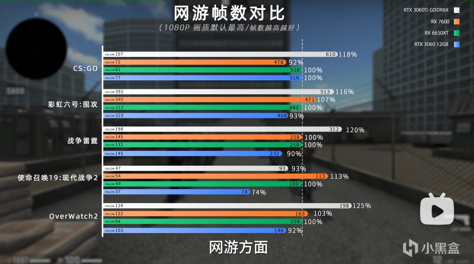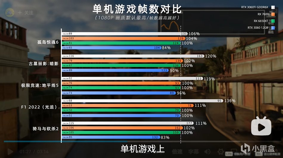 遊戲實測,見BV1CP411Q7Yp,up名稱 FUN科技。詳細結果及其他遊戲可以移步觀看。 測試爲3060tig6x 3060 12g 6650xt 7600的對比測試。