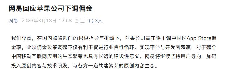 网易:“有利于促进行业良性循环、实现平台与开发者双赢,对整个中国移动互联网应用的生态繁荣具有建设性意义。”