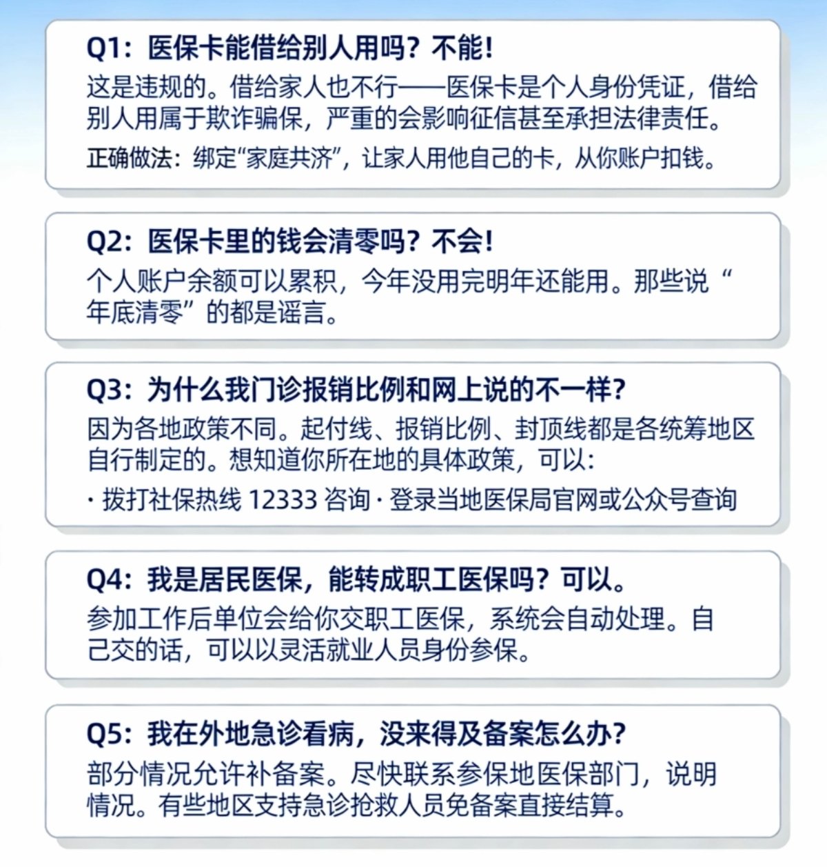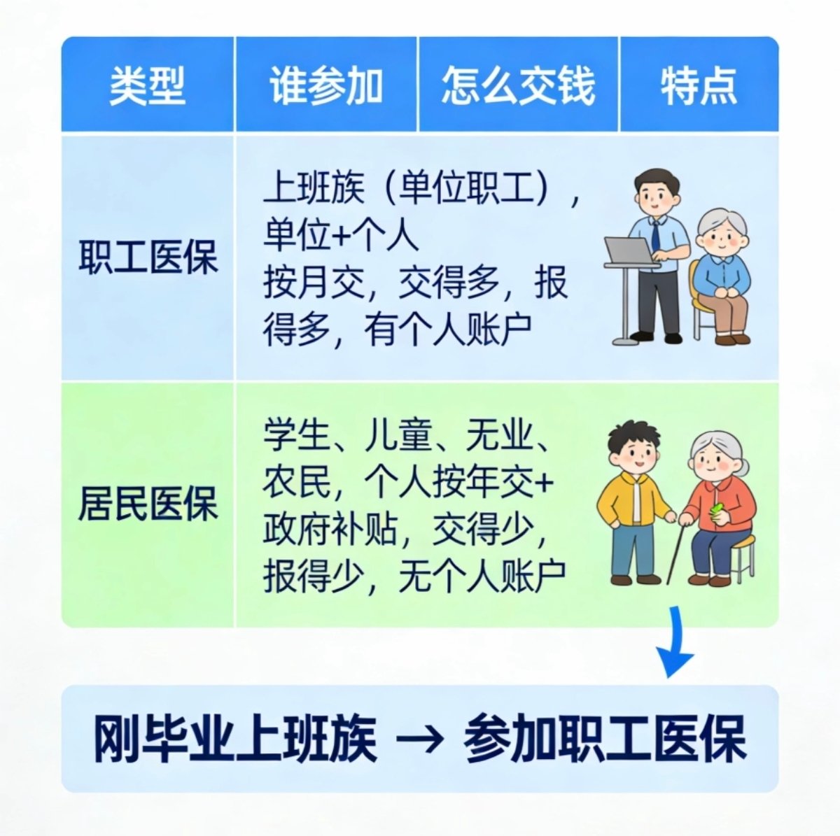 ③ 居民醫保轉職工醫保 畢業前交的是居民醫保,上班後單位交職工醫保——系統會自動處理,一般不需要自己操作。