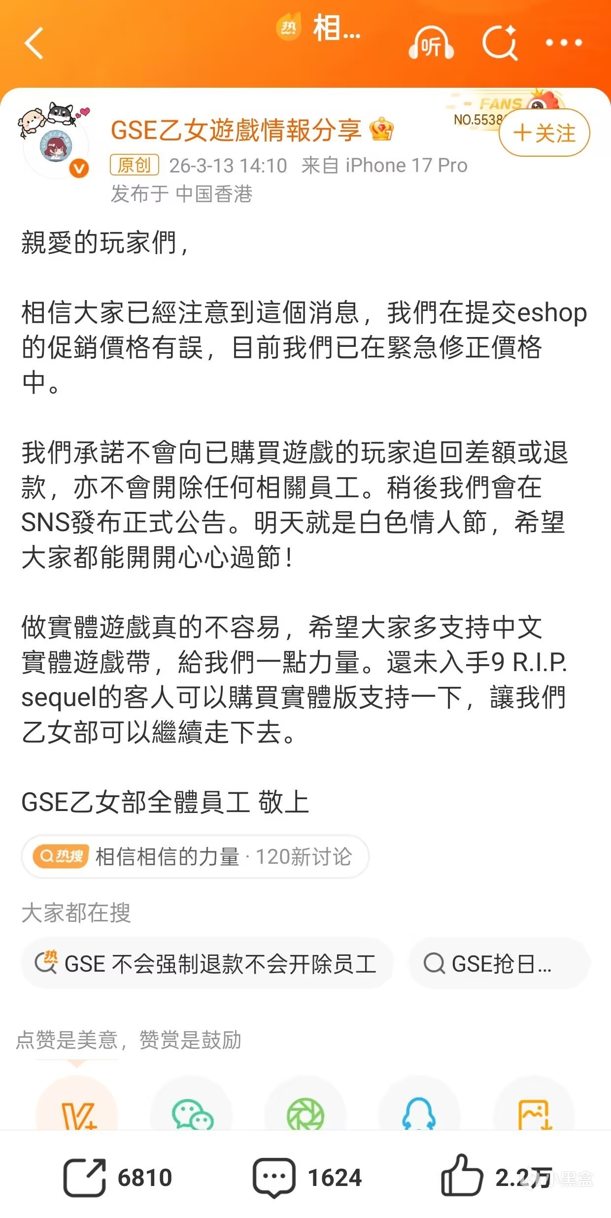 昨天一天港区NS充值卡都在被疯抢,任天堂香港官网几乎崩了一整天,要么就是网站一直加载不出来显示Sorry,要么就是买的充值卡迟迟不发,现在官网的充值卡还被买缺货了