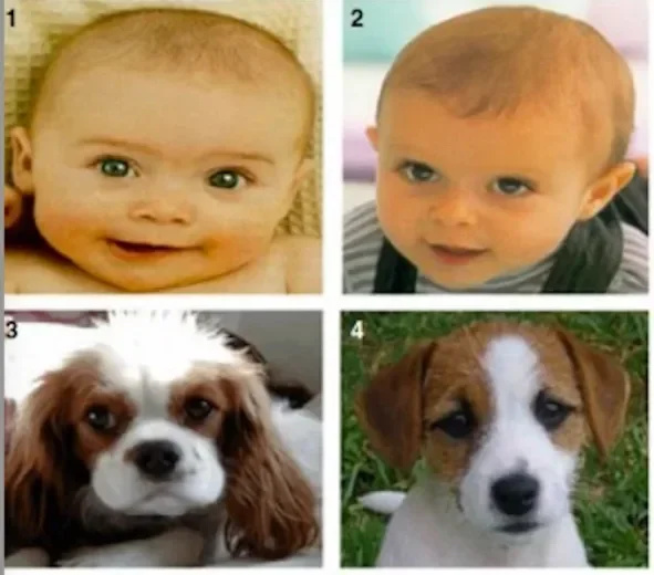 狗子的外貌也激發了人類的育兒本能。嬰兒臉龐的大眼睛、小鼻子和圓臉(即“嬰兒圖式”)讓人感到可愛,狗子尤其是短頭犬種(如哈巴狗、法國鬥牛犬)保留了幼態特徵,觸發了類似的關懷反應。例如,狗子的“ puppy eyes”表情通過抬高眉毛製造大眼效果,讓人覺得它們像在表達哀傷,加速了收養速度。短頭犬種的行爲也更依賴人類,喜歡被抱和撒嬌,彷彿永遠長不大的孩子。