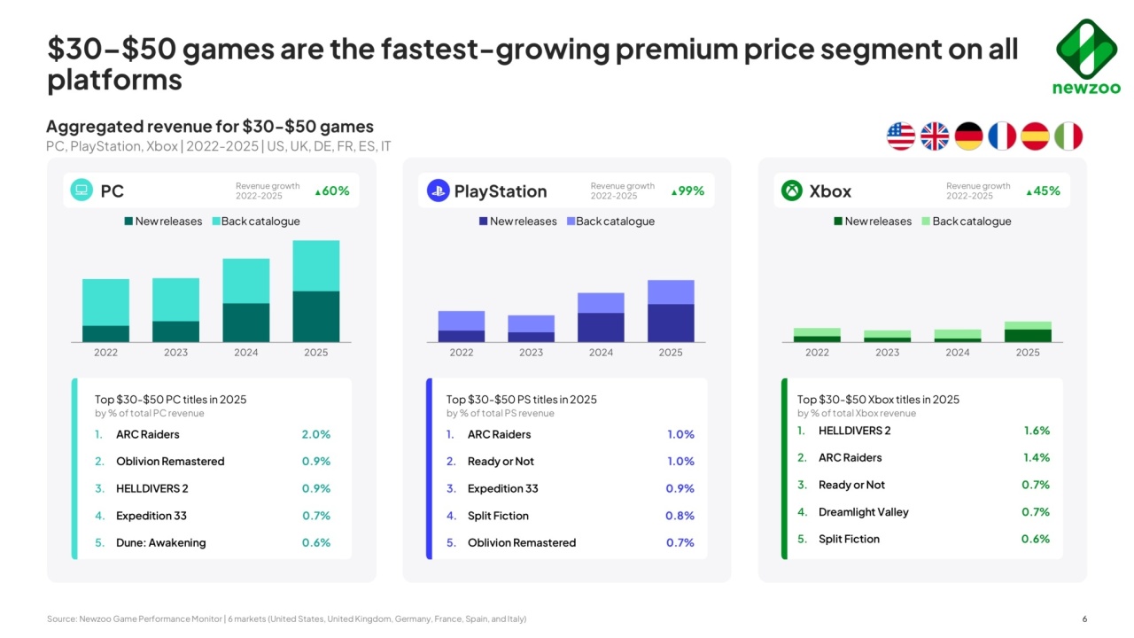 《Arc Raiders》是30-50美元中等遊戲區域的最大贏家,PC市場作爲其主要平臺總收入超過另外兩個平臺;PS市場也因爲《嚴陣以待》的移植,收入增長達到99%,Xbox市場因爲《絕地潛兵2》的移植增長45%。