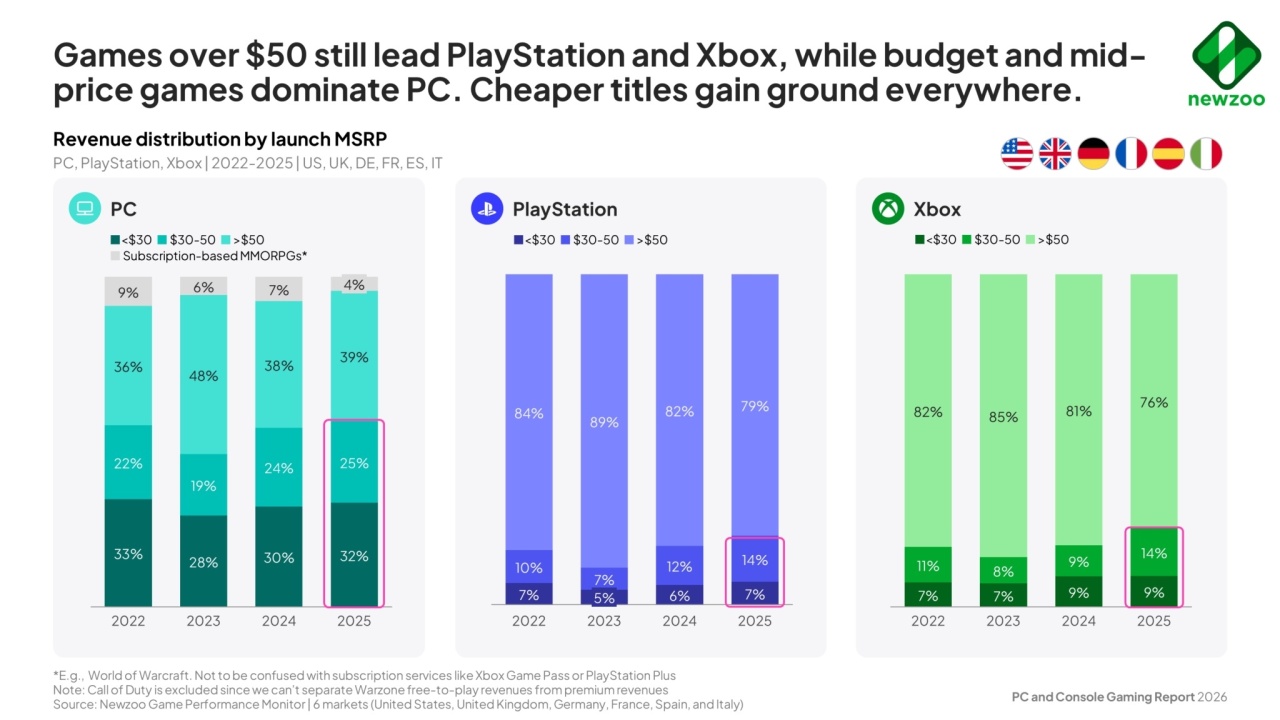 在50美元以上的市場,PS平臺佔到了79%,另外Xbox平臺佔到76%;而PC市場更多元,30美元以下的遊戲市場也有32%。