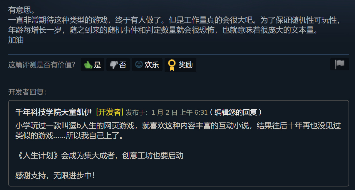 “小学玩的,就喜欢这种内容丰富的互动小说,结果往后十年再也没见过类似的游戏……所以我自己上了。《人生计划》会成为集大成者。”
