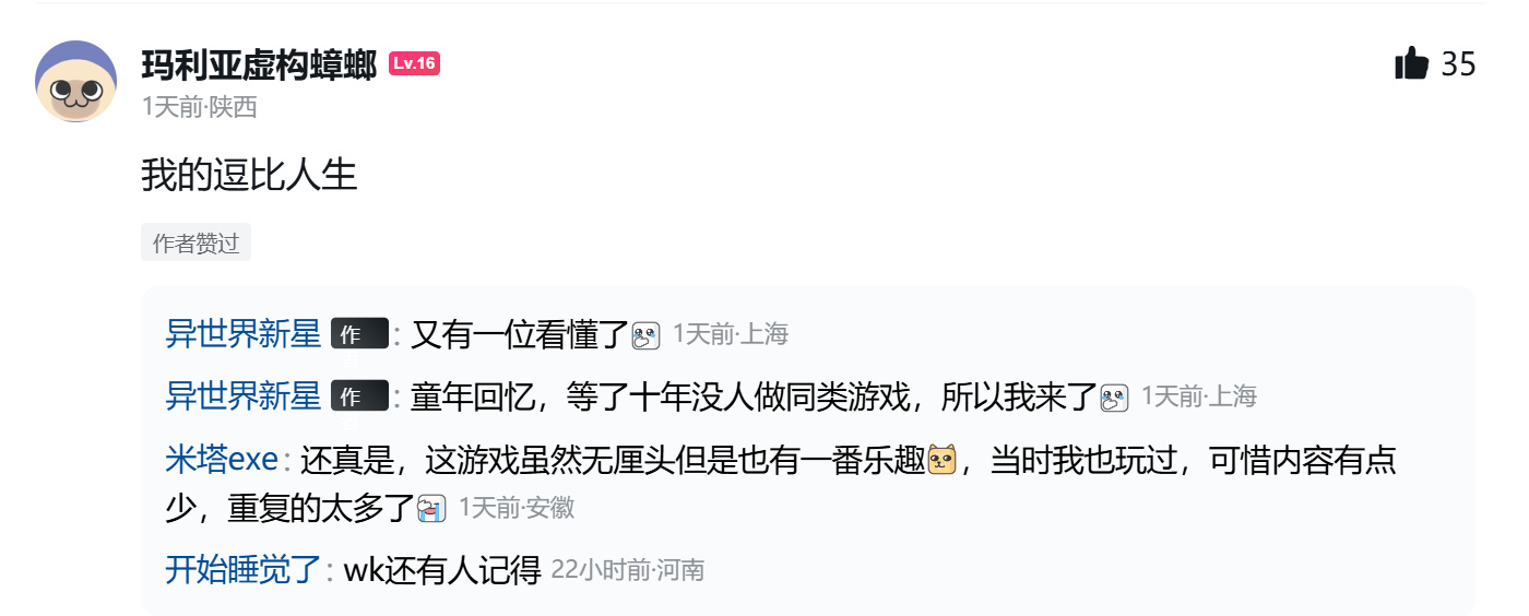 平时写点文章介绍游戏剧情+整活,但平均每几万次阅读才会出现一个评论说:“哎,我想起了以前玩过的一个神人小游戏——如图”