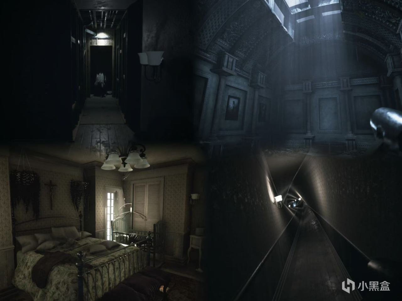 采用写实逼真的环境细节与超现实扭曲的空间变形相结合的心理恐怖视觉风格