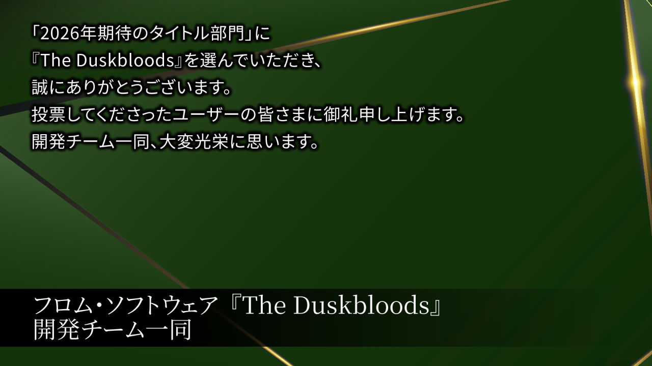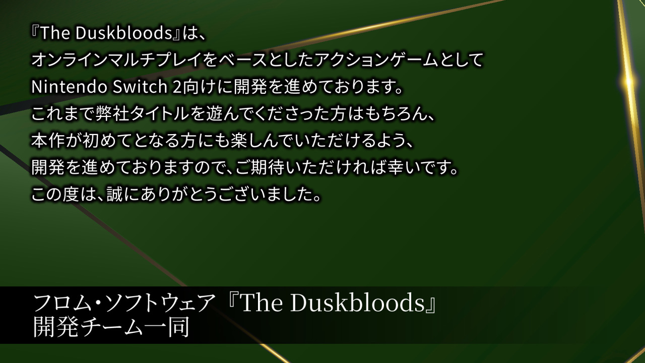 FromSoftware代表人在领奖时表示:“《黄昏血族》是一款以在线多人游戏为基础的动作游戏,目前正面向Switch 2平台开发。”