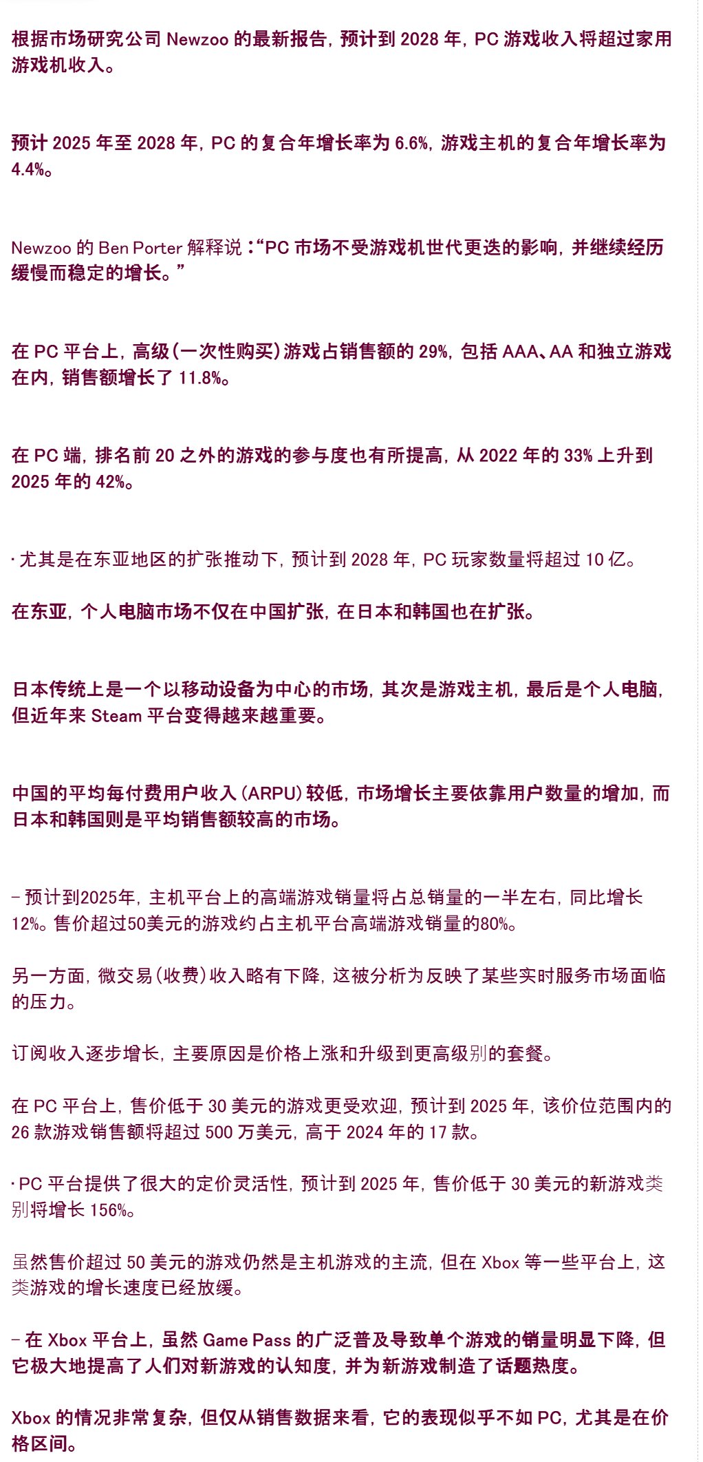 值得关注的是,东亚市场正成为 PC 玩家增长的新引擎,日本和韩国等传统主机/移动端大国对 Steam 等平台的兴趣显著提升。