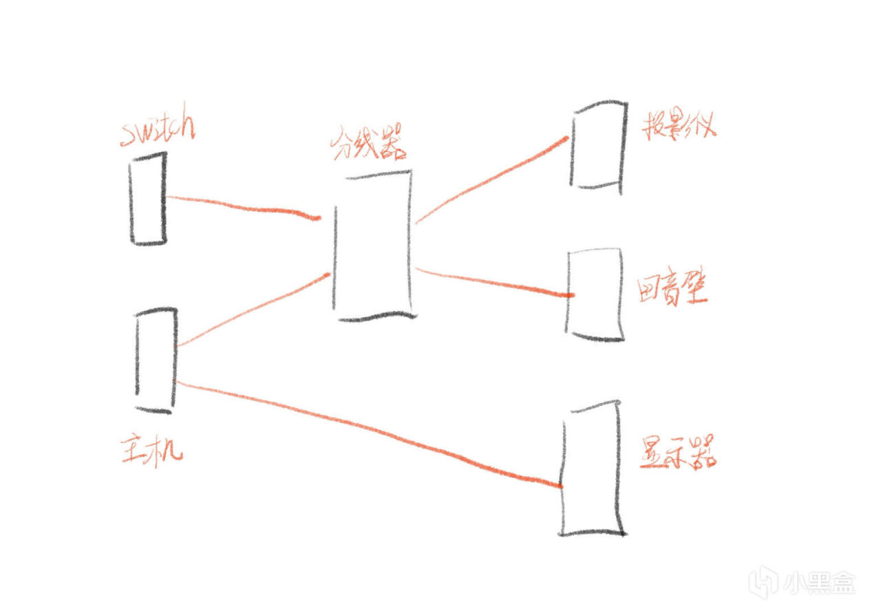 主机up主用的是电脑、switch做输入源,因为等于电竞房客厅二合一了,所以在一个房间,盒友根据自己空间,可以选择不同房间分开放。