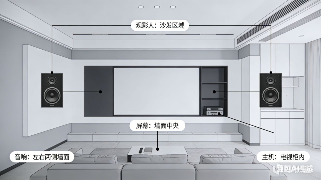 简单来说就是,要确定好观影人的位置,屏幕位置,音响位置,主机位置,基本的空间规划就完成了。