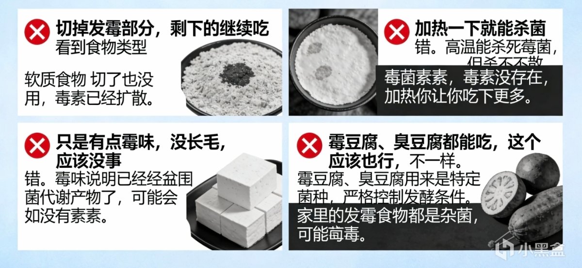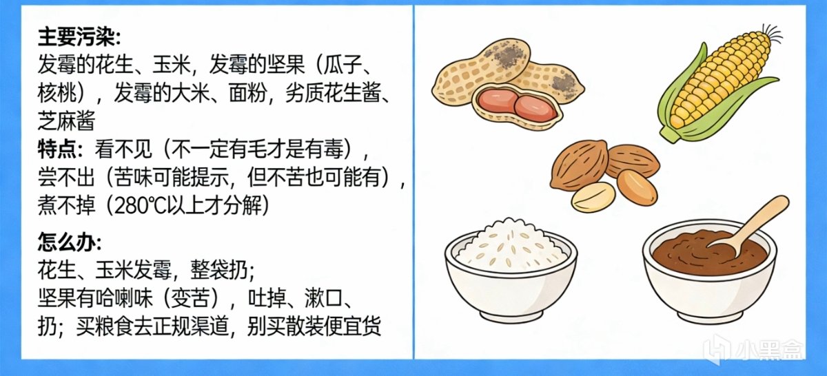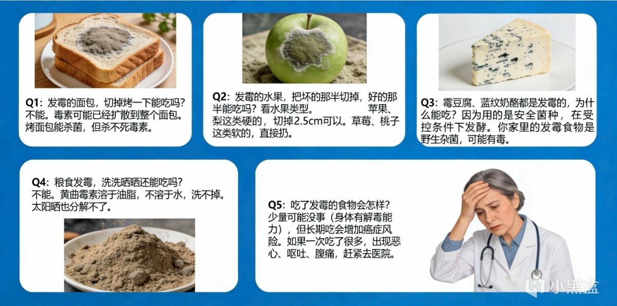 有些霉菌会产生真菌毒素,比如大名鼎鼎的黄曲霉素(一级致癌物,比砒霜毒68倍)。这些毒素耐高温,煮熟了也灭不掉。