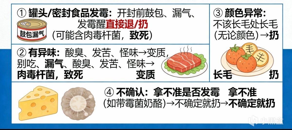 如果罐头、真空包装的食品开封前就鼓包、漏气、发霉,别打开,直接退/扔。