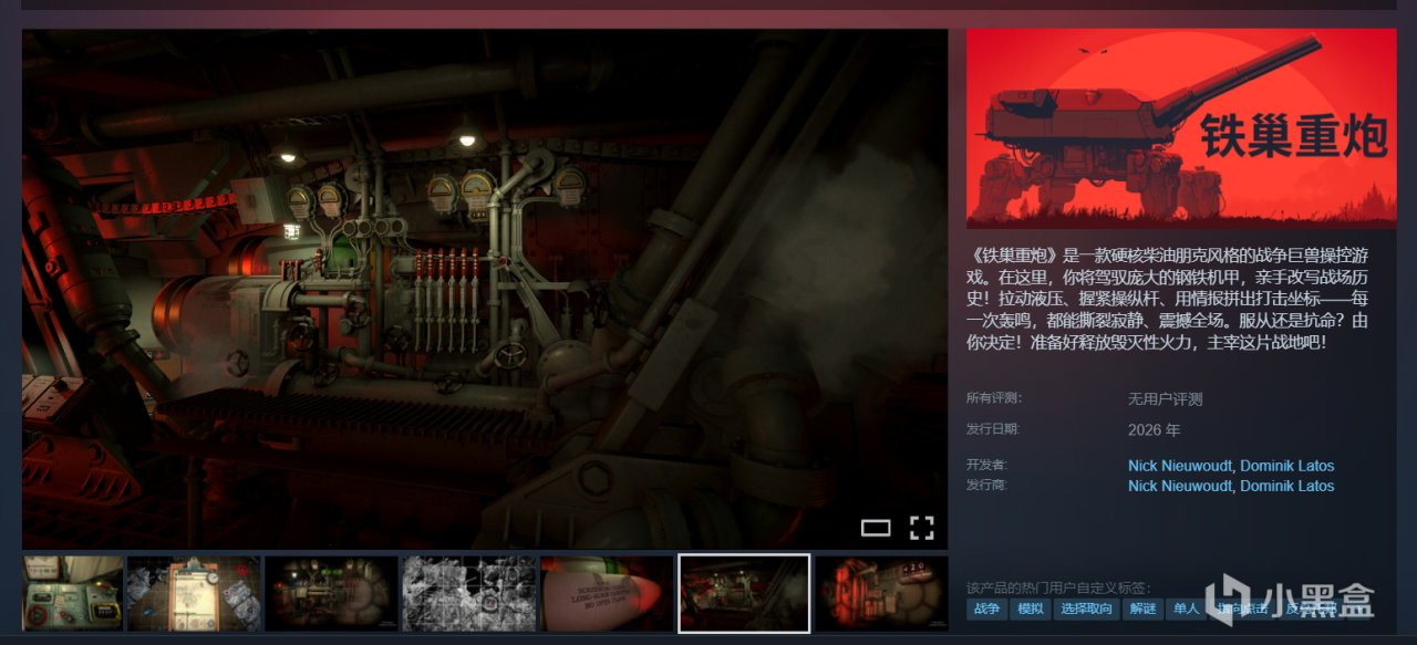 《铁巢重炮》是一款硬核柴油朋克风格的战争巨兽操控游戏。在这里,你将驾驭庞大的钢铁机甲,亲手改写战场历史!拉动液压、握紧操纵杆、用情报拼出打击坐标——每一次轰鸣,都能撕裂寂静、震撼全场。服从还是抗命?由你决定!准备好释放毁灭性火力,主宰这片战地吧!感觉会是很硬核的游戏,但它的整体的美术风格太惊艳了。