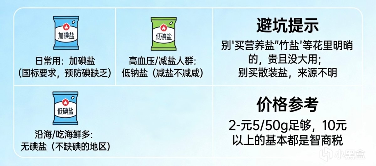 日常用:加碘盐(国标要求,预防碘缺乏)
