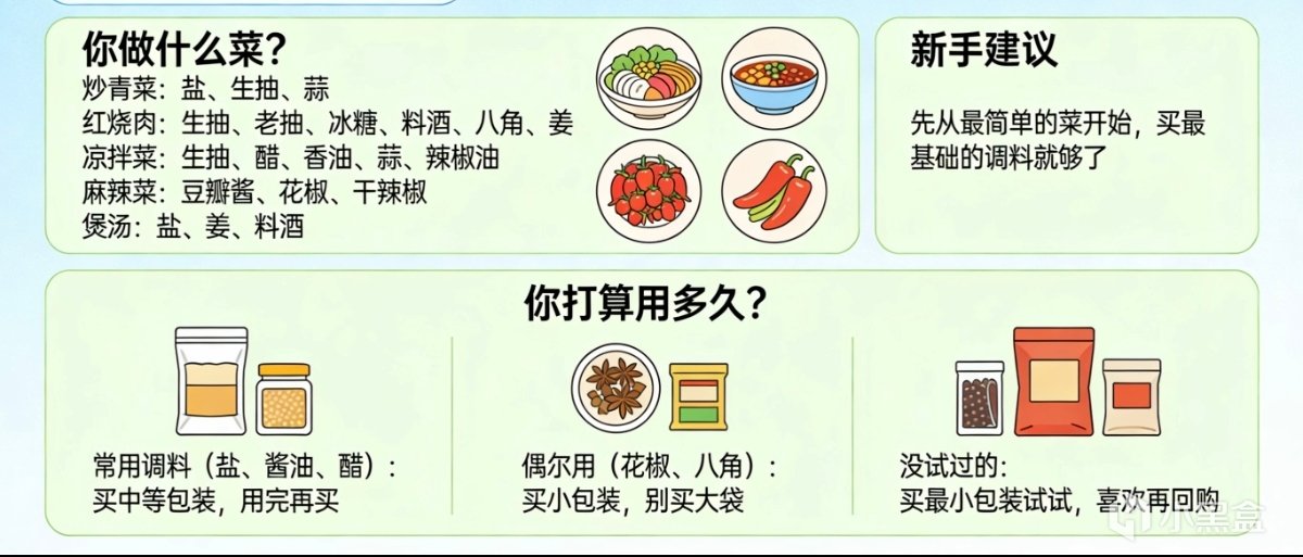 先想好要做什么,再买调料。别看着啥都想买,回家全落灰。