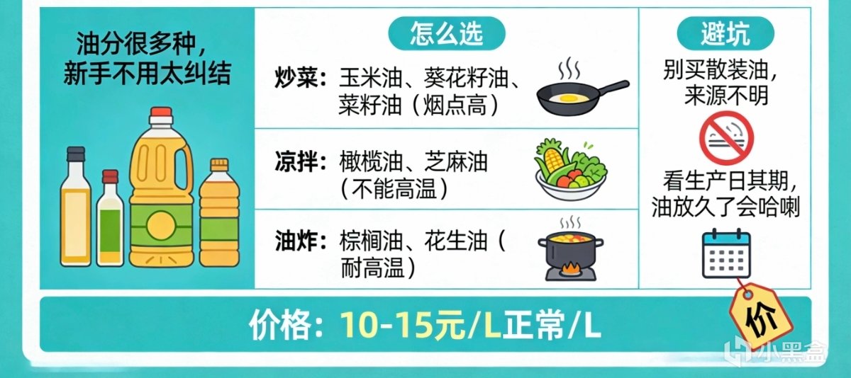 炒菜:玉米油、葵花籽油、菜籽油(烟点高)