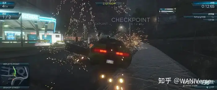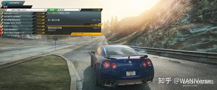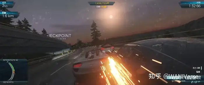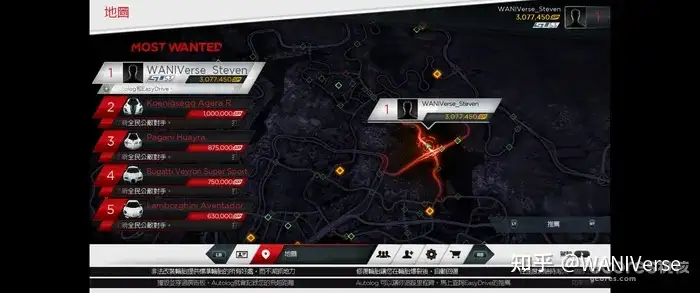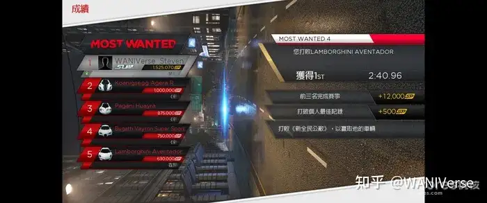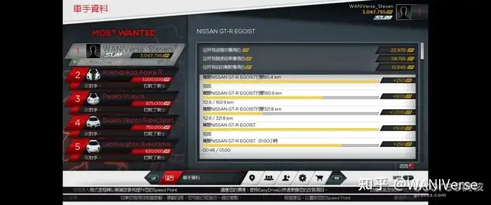 这个速度点是去判定你流程推进的:你积累了多少速度点,就能挑战那些最高通缉的黑名单列表。这个游戏是没有剧情的,没有战役。你可以把这个黑名单列表理解为它的“战役”,你打败这 10 辆车,就算通关。那你打败每一辆车,需要积累速度分去解锁和他们决斗的机会。如何解锁速度分呢?就是通过比赛、通过特技、通过各种各样的特殊动作。