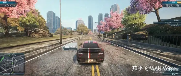 包括它的赛道设计也很疯狂。它赛道里有大量飞跃,尤其是公园里面那些飞天的桥段,估计一飞能飞个五十米远。整个游戏都突出一种我在标题里说的:它是整个《极品飞车》系列里最意识流、最癫狂的一座。
