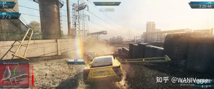 因为这一座的美术风格其实和后面的《宿敌》很像,或者说《宿敌》是和它很像。它们两个都主打一个乱花迷人眼。它们的美术风格里,充斥着大量甚至夸张化的环境破坏、粒子特效以及光晕。这些东西会严重扰乱你的视线。你跑比赛的时候,真的是一边是雾,一边是灰,一边是光晕,一边是烟雾,还有各种撞碎的碎片在那里飞来飞去。