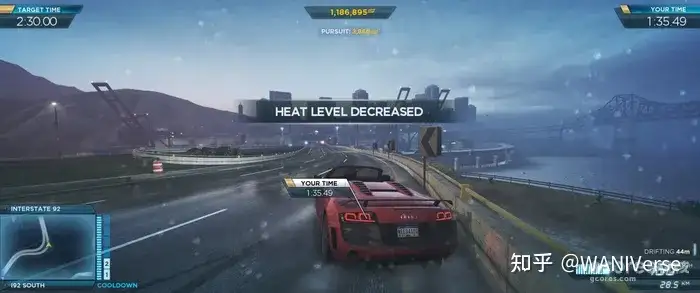 这个东西我觉得厉害的地方有几点。第一,它给你的奖励足够多。你在玩这个游戏的过程中,会觉得它的正反馈特别足。之前我在别的游戏,比如《瑞奇与叮当》里讲过,一个游戏如果实时反馈特别多,你会觉得自己做什么都在被奖励。《最高通缉》就是这样。你撞毁一辆车,解锁一个装备,开上一辆新车,甚至每辆车的漂移、擦身而过、各种指标,全部都有单独的一套进度。不是整个游戏一套,而是每一辆车一套。