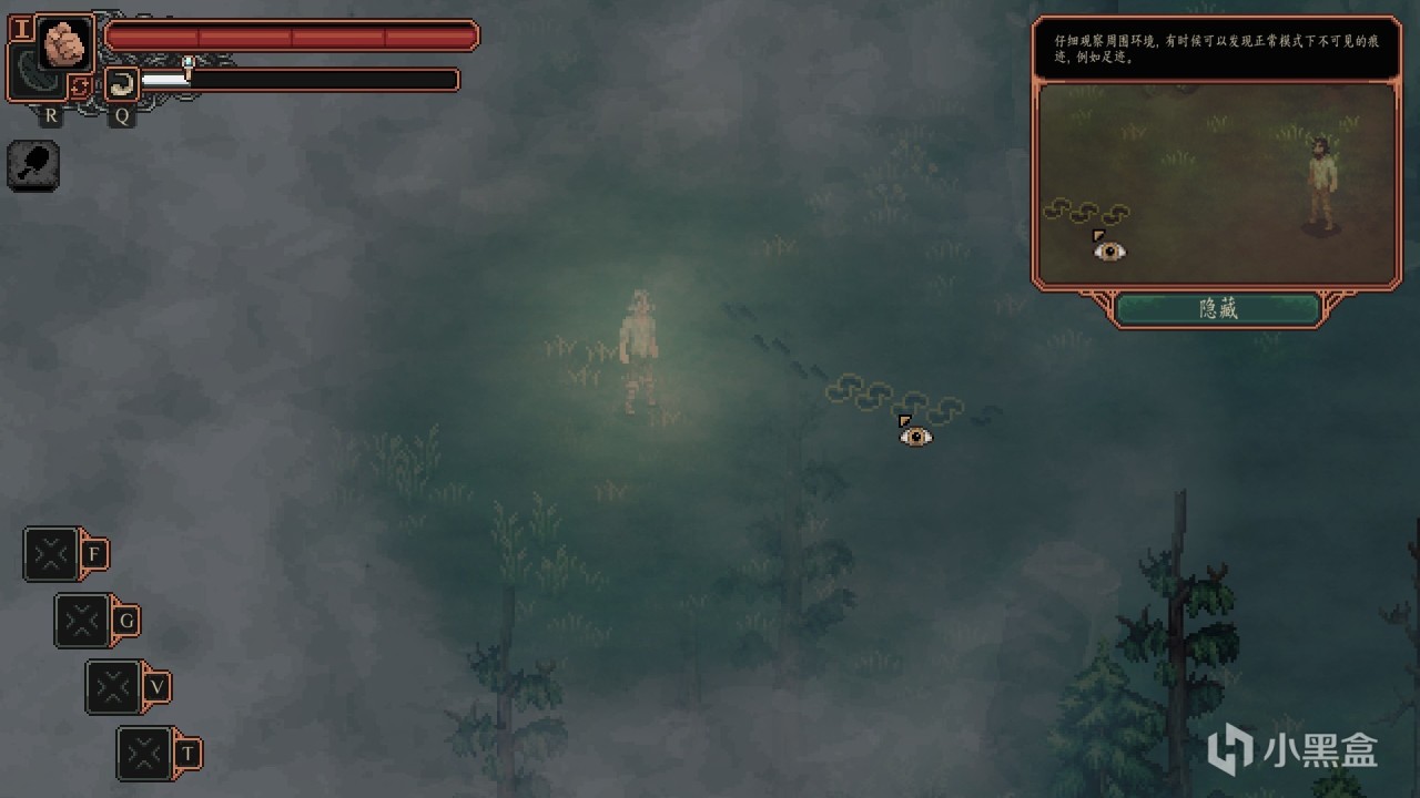 游戏巧妙地利用俯视角做出了一些玩法,比如长按右键可以透过障碍物和云雾观察到被遮挡的物体,脚印等特殊痕迹也会被高亮显示,这让探索解谜变得非常有趣。