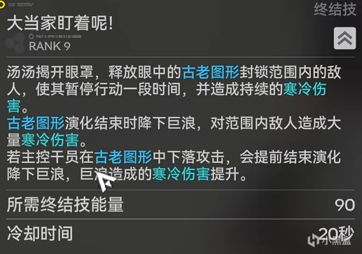 湯湯的終極技,砸瓦魯多!對敵人強控凍結,BOSS也一樣凍,對範圍內敵人造成大量傷害,若在大招自動結束前主控角色進行一次跳躍攻擊,則提升終結技的傷害並提前結束。這個要結合天賦來看,天賦二呼風喚浪,在大招過程中下落攻擊會直接贈送一次強化戰技,效果不變但傷害增加60%,也就是說大招期間可以下落攻擊來消耗渦旋掛冰掛法術脆弱,即使沒渦流進行下落攻擊也是大招傷害提升,削韌提升和掛一層冰觸發一次連攜技產生渦輪的收益。