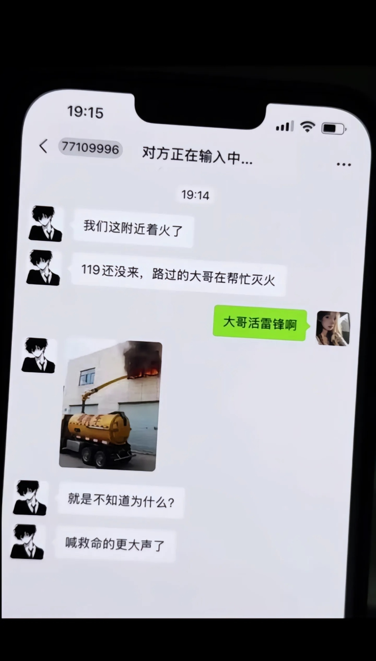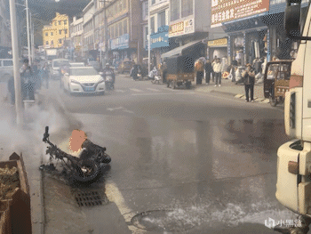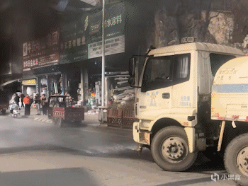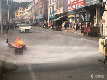正当大家手足无措不知道该怎么办的时候,旁边一辆洒水车放着音乐就开了过来,只见洒水车司机调整了一下车头位置,就开始喷水,期间隔壁商铺的小伙子还拿着一桶水准备上前救火。