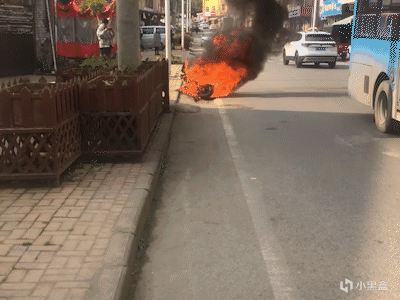 路边一辆电动车着火了,看上去火势还挺大的,冒着滚滚黑烟。