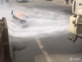 但是这可是锂电池啊,那么大的水压着喷,依然无法灭掉火焰。洒水车司机还在车里面拿着手机拍短视频呢!不过火势好像是得到了一点控制。