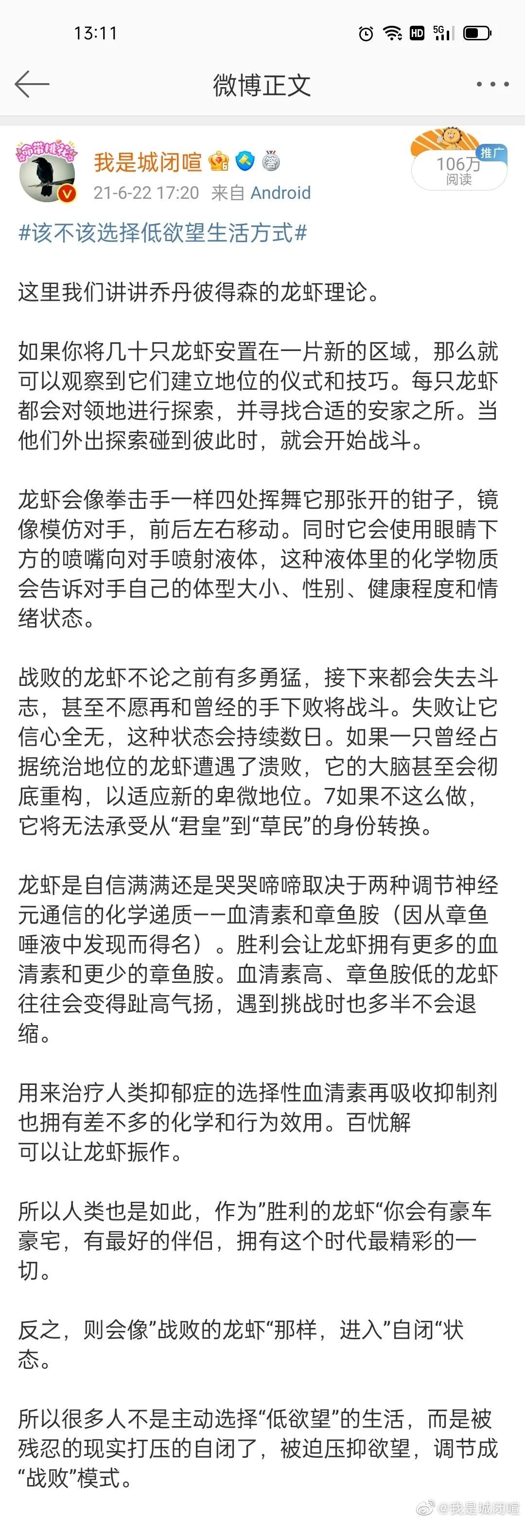 生本能和死本能它們統稱爲性趨力,也叫力比多。生本能是指我們天生的自我保護和物種延續的動力,而死本能代表着我們走向自我毀滅的動力。當一個人不斷遭受打擊,一次次失去希望,在龐大的壓力下抬不起頭來……他們就會被死本能纏繞,正是這樣的死本能,限制了他們的血清素,讓他們變得悲觀,迴避。所以被死本能纏繞的人,會理所當然的沉溺於“喪文化”,進行自我傷害甚至毀滅。這裏我們再次溫習一遍“戰敗的龍蝦”: