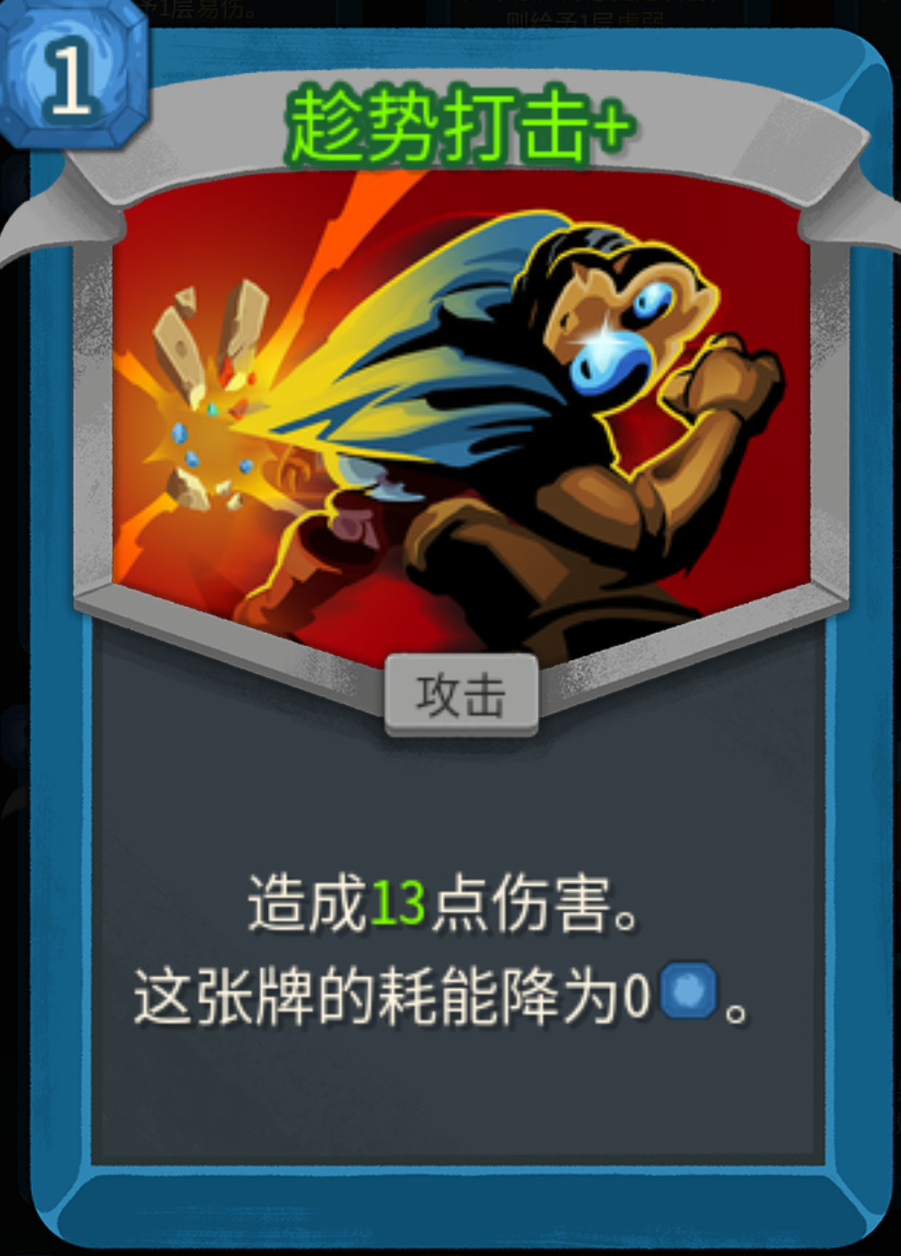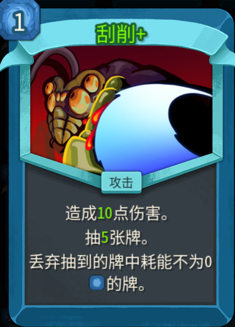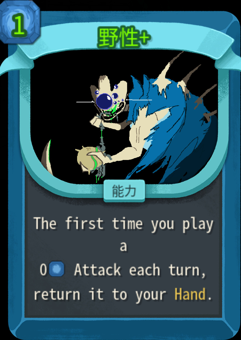野性的翻譯問題還是沒有沒有修復,好在是因爲並不複雜,效果是你使用的第一張零費攻擊卡,會回到你的手上。天生就是爲刷爪擊而生,普通版本是2能量,升級之後變爲1能量,還是推薦敲一下。