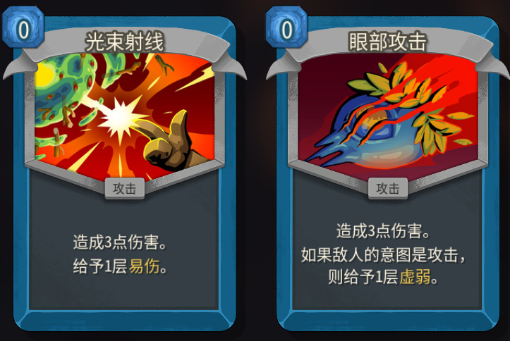 流派主要是圍繞零費卡構築,光束射線這兩張,一張上易傷增加輸出能力,一張眼部攻擊上虛弱,緩解生存壓力。這兩在卡組裏面可以各抓一張,優先級上面光束射線要略高於眼部攻擊,畢竟咱們是偏攻殺的卡組,建議優先升級,兩層易傷是質變。