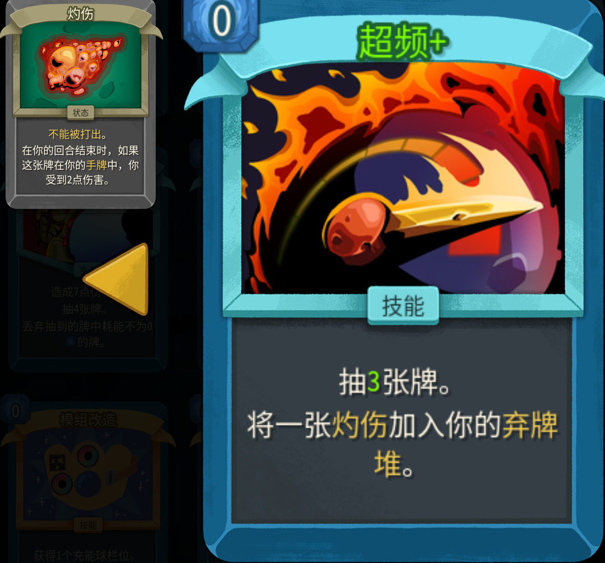 超頻基礎版0費抽兩張,升級之後變爲抽3張,加快運轉新神卡。負面效果是往棄牌堆塞入灼傷,機器人基本是玩均卡的,卡組不會太小,放棄牌堆沒有那麼致命,還能充當壓縮和散射炮的燃料,小二很看好這張卡。