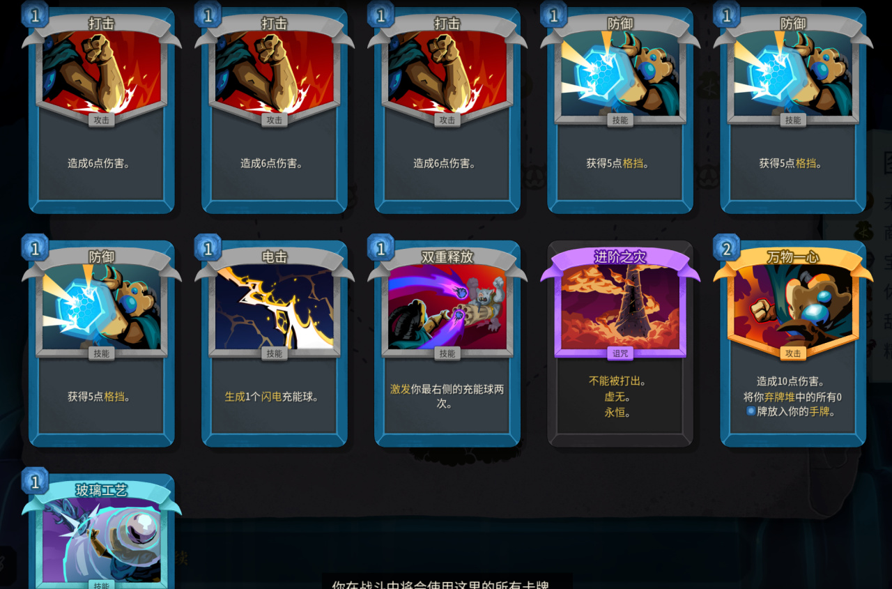 小二這裏玩了一個進階10的對局,開局選扣血變化牌選項(樹葉藥膏)直接給一張萬物一心和玻璃工藝,種子:VMBQ8EUG90。