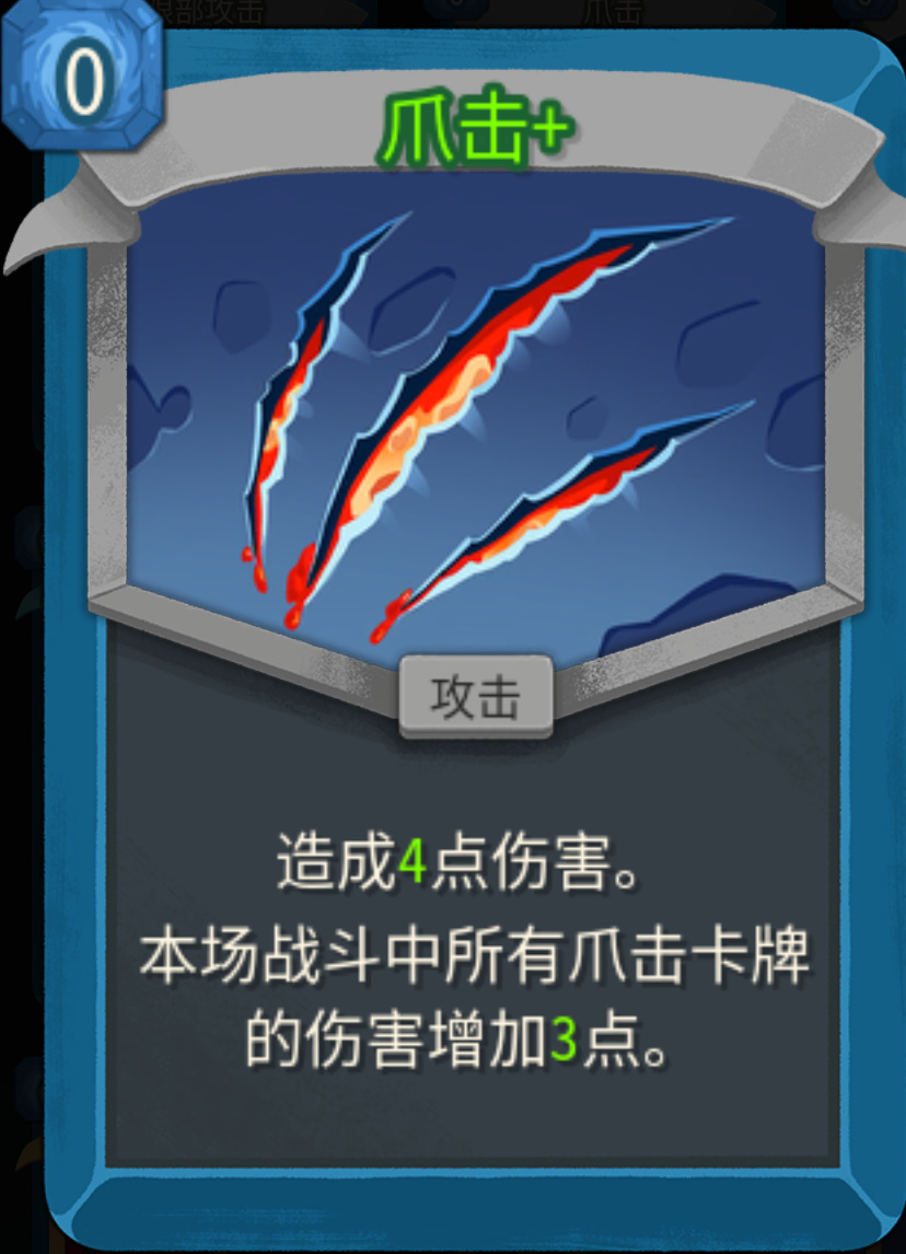 咱們這個流派就叫做爪擊流,核心當然離不開爪擊,爪擊是0費攻擊牌,每打出一張爪擊,所有爪擊的傷害都會永久+2(升級後+3),越打越痛,後期單張爪擊能疊到70+傷害,0費無限甩,BOSS血條直接蒸發。