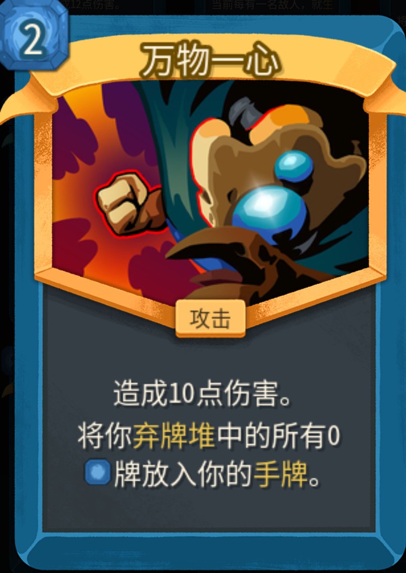 萬物一心可以將棄牌堆中的所有零費牌回手,升級之後只加4點傷害,完全沒有升級的必要,只要這個回手效果即可。卡面造型上有點像琦玉老師的普通拳,聯動上面想必大家應該也明白了,就是先使用零費牌,再拍萬物一心回手,不過需要注意,手牌上限是10,使用的時候覺得留夠空位。