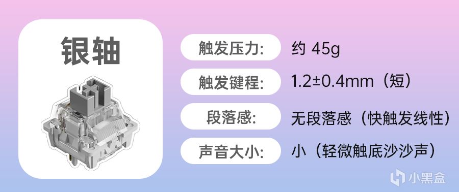 银轴:介于红轴和黑轴之间,触发响应比红轴快,按压力度又比黑轴轻,兼顾打字和游戏。