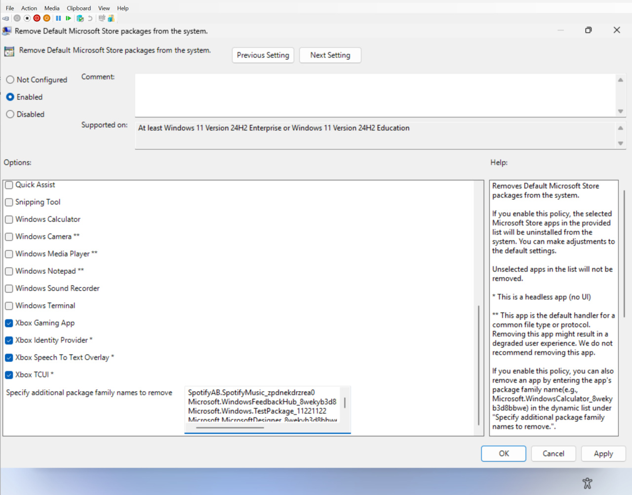 操作路径:Computer Configuration > Administrative Templates > Windows Components > App Package Deployment > Remove Default Microsoft Store packages