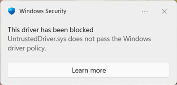 对于普通用户,若进入强制模式后遇到驱动被拦截的情况,系统将弹出Windows安全中心通知:"This driver has been blocked. UntrustedDriver.sys does not pass the Windows driver policy."(如上图所示)。这一改变显著提升了系统安全性,但也可能对依赖老旧硬件驱动的用户造成兼容性挑战。